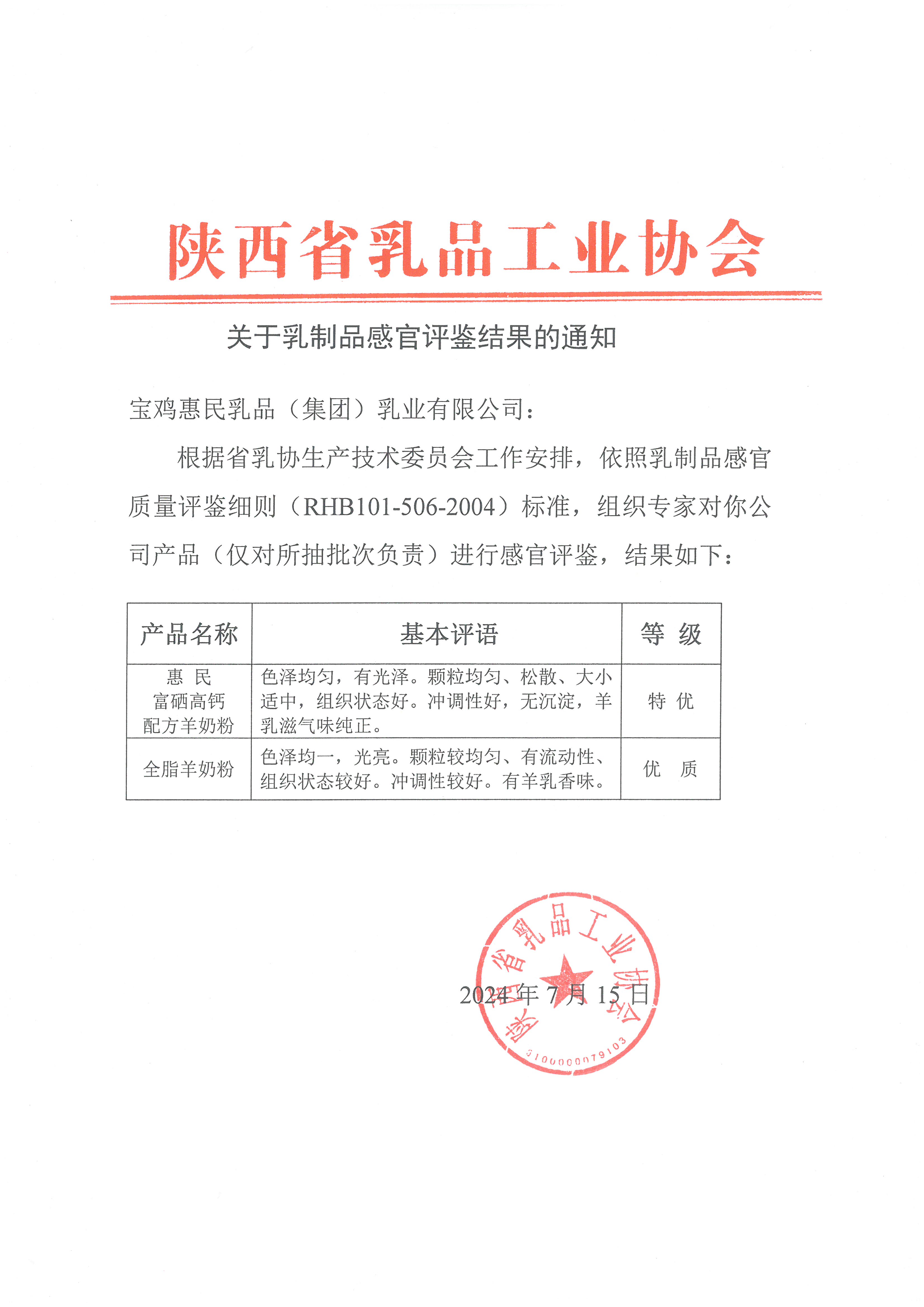 2024-07陕西省乳品工业协会 关于乳制品感官评鉴结果的通知