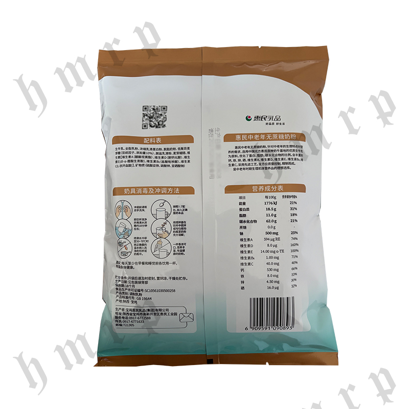 中老年无蔗糖奶粉 规格:350克(25克×14) 条码:6909591090893 配料表:生牛乳、全脂乳粉、浓缩乳清蛋白粉、脱脂奶粉、低聚异麦芽糖(双歧因子、添加量10%)、脱盐乳清粉、麦芽糊精、维生素【维生素A(醋酸视黄酷)、维生素D(胆钙化醇)、维生素E(dl-α-醋酸生育酚)、维生素B6(盐酸吡哆醇)、维生素C(L-抗坏血酸)】、矿物质(硫酸亚铁、硫酸锌、亚硒酸钠).
